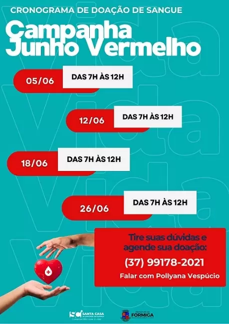 A Prefeitura de Formiga, em parceria com a Santa Casa, convida a população a participar da Campanha Junho Vermelho, uma ação de conscientização sobre a importância da doação de sangue.